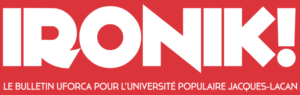 Le premier numéro d’Ironik ! est arrivé dans vos boîtes mail en septembre 2014. Quarante numéros plus tard, Ironik entame sa septième saison, sur le site Uforca. Romain Aubé en est le responsable, et la nouvelle rédaction est à pied d’œuvre pour poursuivre le travail engagé, dans l’esprit « offensif mais non polémique » d’Ironik !, qui vise à « débusquer la jouissance à l’œuvre à la racine de tous les discours1», comme l’indiquait Marie Laurent dans son tout premier éditorial.